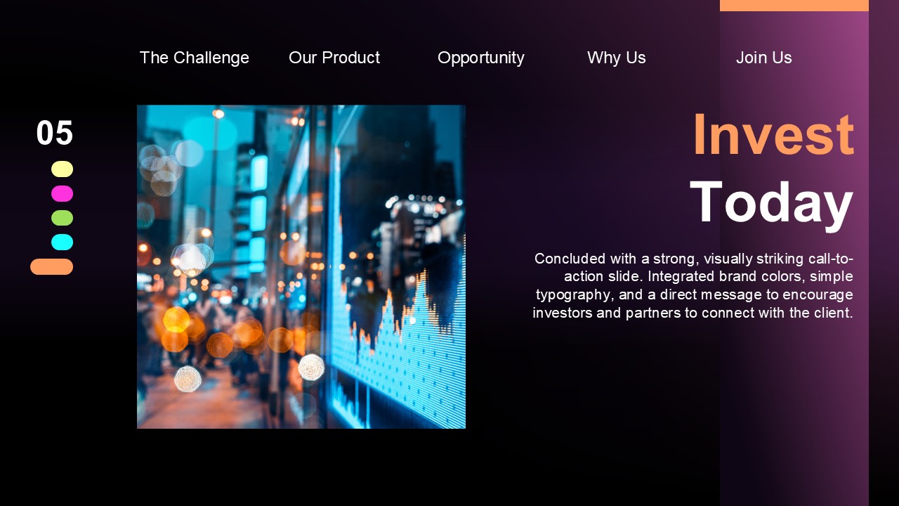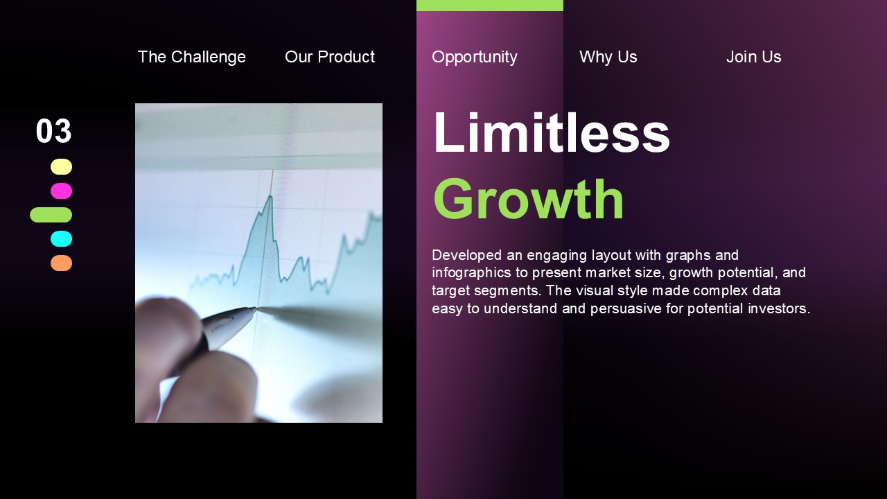 I developed a bold visual identity with dynamic layouts and a strategic use of color that draws attention to key metrics and milestones. The deck was structured to tell a clear story: from the problem, through the solution, to the market opportunity and the team behind it. Data visualizations were designed to make complex information immediately accessible, so investors can follow the narrative without getting lost in the numbers.